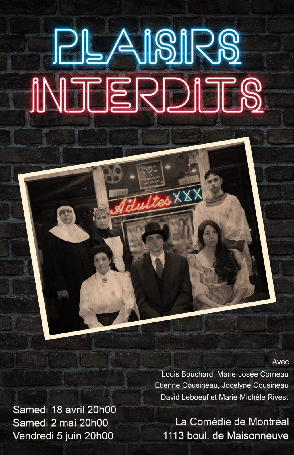 Six personnages aux airs puritains nous transportent dans l’ambiance d’un cabaret grivois au début du 20ème siècle, époque où les plaisirs de la chair étaient tabous… Jamais vulgaires, toujours grivois, ils vous surprendront par leurs propos… Oreilles chastes s’abstenir.